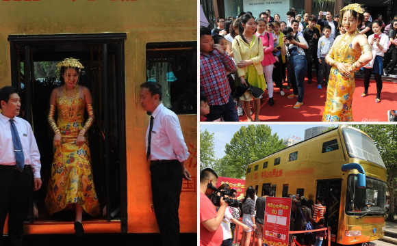 4月25日,一輛“黃金公交車(chē)”亮相山東濟(jì)南。據(jù)介紹,該公交車(chē)80%的部分都貼了金箔,“黃金美女”模特身上佩戴的黃金飾品價(jià)值兩百萬(wàn),公交車(chē)車(chē)內(nèi)掛滿(mǎn)了數(shù)千件黃金飾品,重達(dá)幾十公斤,總共價(jià)值500余萬(wàn)。(來(lái)源:騰訊新聞 陳寧/CFP)