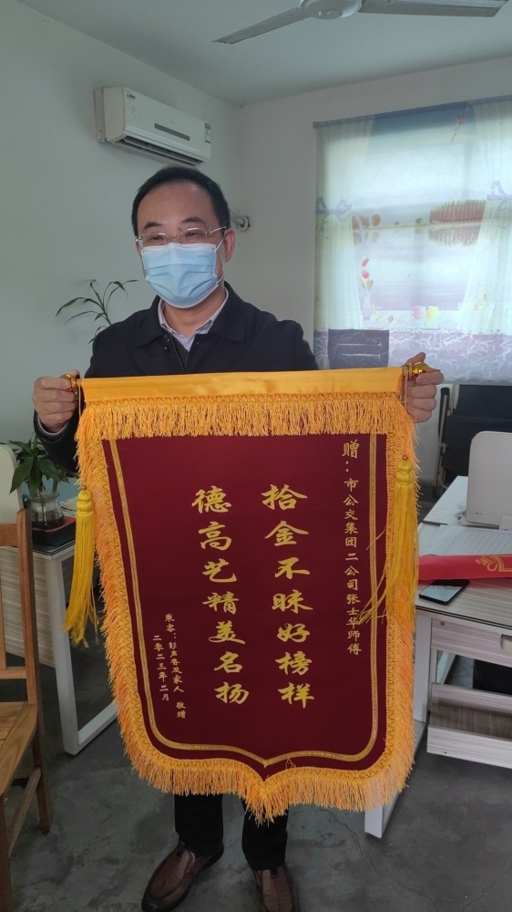 當(dāng)日下午,彭奶奶家人著急的撥通客服電話尋找遺失的物品,工作人員立即幫助其耐心尋找,并給3路線出車的所有駕駛員下發(fā)車載消息。當(dāng)?shù)弥锲芬焉辖还就咨票9芎?,失主委托家人隨即趕到公司調(diào)度室,在仔細(xì)核實后,拿到了自己失而復(fù)得的物品,并將一面印有“拾金不昧好榜樣,德高藝精美名揚”字樣的錦旗送到公交公司,對張師傅表達了誠摯的謝意。