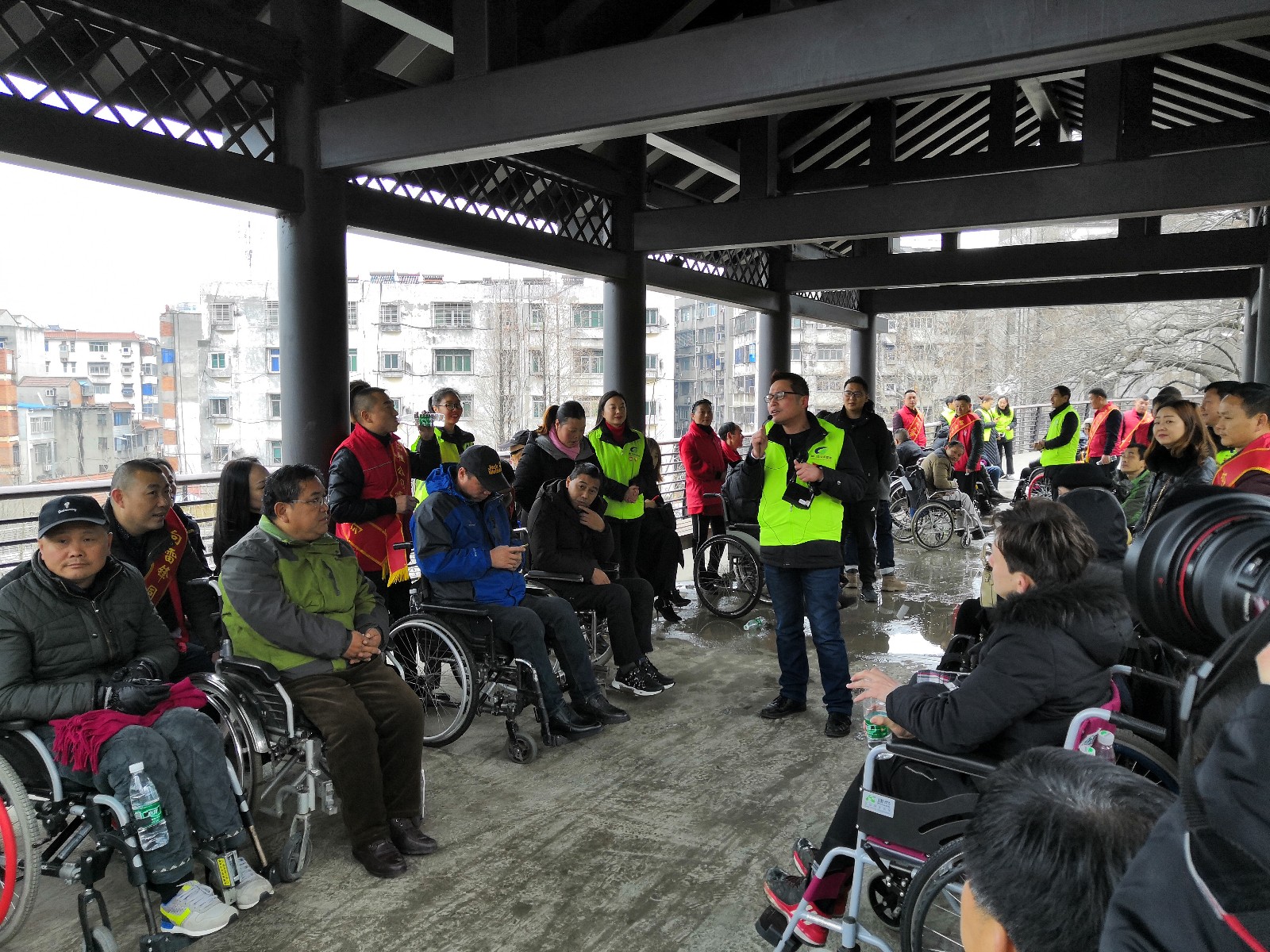 龍泉公園長廊,在公園導(dǎo)游的介紹下,殘疾朋友及隨行的志愿者們更清楚的知道了龍泉公園的建園歷史和荊門故事。
