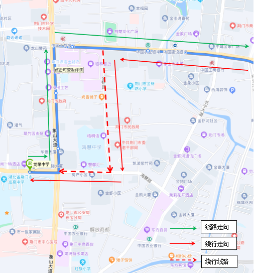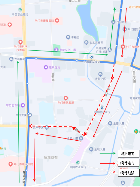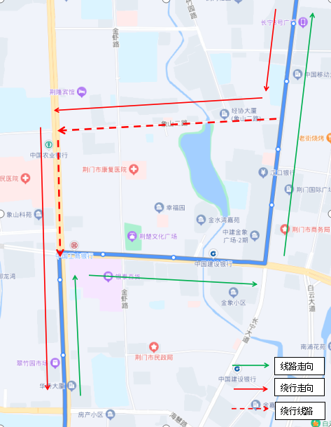調(diào)整后新增停靠站點:瀏河橋(西側(cè))、金寧小區(qū)(西側(cè))、荊門電視臺(西側(cè))、鳳臺社區(qū)(北側(cè))、海慧中學(北側(cè))。